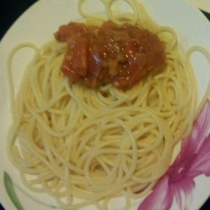 加入西柿丁一起熬出西红柿酱,随后倒入番茄沙司和肉末,最后加一些盐和黑胡椒粉即可