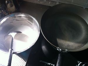 第三步利用白菜脱水的时间我们可以做一下酱汁的操作,我选的是藕粉 也可以用玉米粉 红薯粉 锅上烧热水将融化好的藕粉倒入锅内快速搅拌 记得水不能大开锅底起泡就行 搅拌成浆糊状 放凉备用