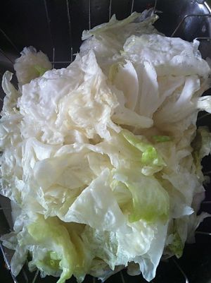 第二部将白菜切片 取白菜片时要轻柔不要用力以防白菜碎裂 我选的是白菜 以为我觉得圆白菜叶多水份饱满是冬季的首选 当然长白菜方便涂抹酱料和保存 但长白菜邦多 我选的全是菜叶这样吃起来会更细腻口感很好 切过之后把菜叶上均匀涂抹盐 不要涂抹太多以防口味变重 一层一层摆好放入容器中 可以选择锅 或者保鲜盒 脱水2个小时