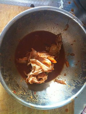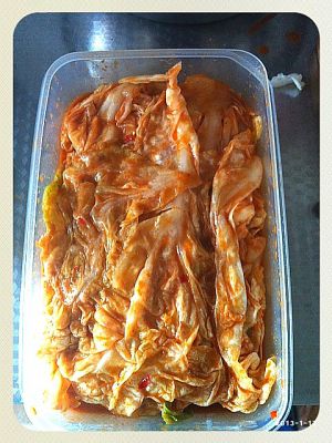 第六 将酱料均与涂抹白菜正反面 放入容器中铺好 也可以几层一起卷起来 方便储存 个人觉得要是在一个月内吃完的好不用卷白菜 平铺味道会更浓郁