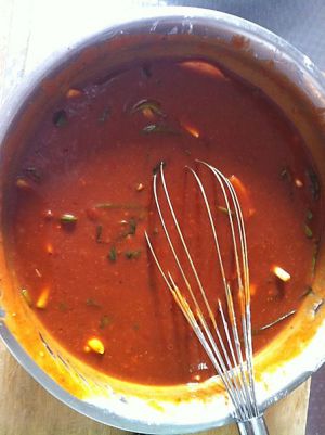 第四 将放凉后的藕粉中加入以上辅料 均匀搅拌 其颜色应是重红色 我的口感是甜 辣 微酸 根据个人口味或酸 或甜 或辣 或咸 建议不加醋 因为泡菜发酵过后会有自然的酸味
