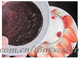 在酸奶表面浇点蓝莓果泥,用牙签画出花纹;