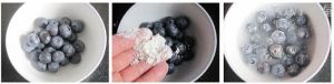 在蓝莓里放一小撮面粉,放点水,用手搅拌几下后用水冲洗,蓝莓表面白色是果霜;
