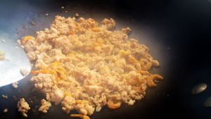 热锅,放油,下虾仁和肉沫翻炒,放些酱油,耗油,糖,翻炒至干水(比较香)