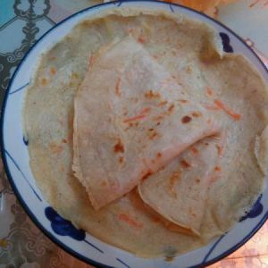 往平底锅摊薄薄的一层,等朝上这面凝固后,把饼翻过来,用中火把翻下的那面煎黄