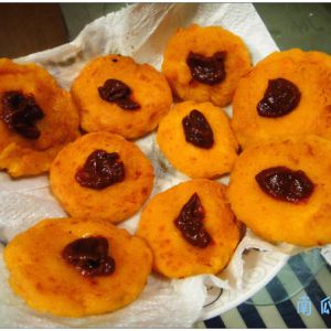 平底锅倒入色拉油加热七成熟放入南瓜球,不停地上下翻身的同时用锅铲压饼,到饼内全熟,大概一分钟左右,出锅,放入平铺厨房纸的盘子内吸油。