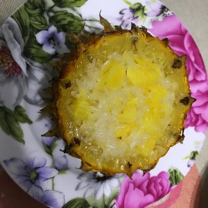 菠萝切丁加入泡好的糯米中,加少许糖搅拌均匀,装入菠萝壳中,放入碗中放入微波炉蒸米饭,蒸熟就完成咯,美味当季美食就做好了