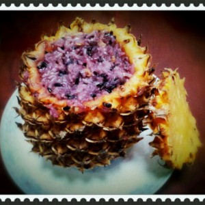 熟菠萝切开上面一小部分,挖出菠萝肉,切成小丁备用,少量的紫米和糯米提前泡2小时以上,泡好的两样米混合白糖拌入菠萝肉提前上锅蒸熟。
