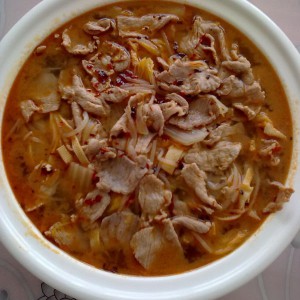 这个时候将前面烹过的干红辣椒捣成末。水沸以后,下入浆好的肉片,加盐鸡精调味儿后盛出。再将刚刚做的干红辣椒末以及剩余蒜末放入刚刚做好的水煮肉片儿上。