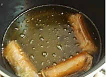 干锅下油烧至油温5成热时(冒泡),放入排骨炸约10秒,然后改用小火炸至排骨浮在油面上(大约5分钟)。再用高温热油复炸一次。