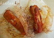 裁剪好的玻璃纸放上腌好的排骨。将以对角包裹的方式包好排骨。