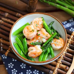 冲洗好的虾肉加入3ml料酒,一小勺盐,一勺淀粉拌匀上浆腌制10分钟,在腌制虾的同时,将芦笋刨去老皮切老根,整根下水汆烫后过凉水切段备用