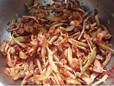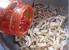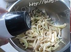 晒好的萝卜干放少许的盐,用手使劲揉,把萝卜干揉软为止。(这一步很重要!切记不可省!一方面去除萝卜的生涩味,一方面可以使做出来的辣椒萝卜更脆。)
