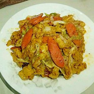 最后切好火腿,白菜,锅内放油,下菜炒熟后放入面疙瘩,加适量盐,少许葱,可以根据口味加点辣椒酱