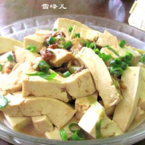豆腐切条,葱切丝,干蛤蜊肉备用。
