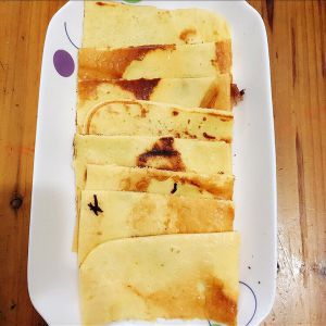 上下火2分钟即可。不沾锅,晃动锅可以晃动饼,然后翻面稍微烙下即可。
