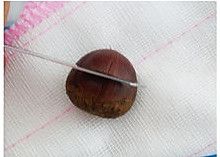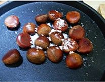 把切好的栗子放入碗中,加入一勺油、一勺白糖,搅拌均匀。