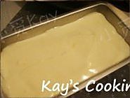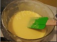 1/4cup的糖和4个蛋黄搅匀,加入玉米油和牛奶搅匀,然后过筛加入低粉和baking powder,轻轻拌匀。