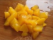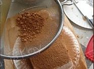 撒可可粉,顶面撒巧克力屑,放几块黄桃装饰,