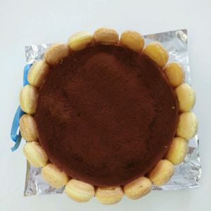 待芝士糊稍稍凝固成不流动状态,再在芝士糊上铺一层沾了咖啡酒的手指饼干,并倒入剩下的芝士糊,放入冰箱冷藏两小时以上