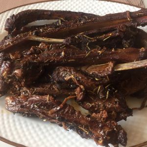 打开烤箱,在羊排上撒花椒辣椒孜然粉,用烤箱余热闷5min,即可装盘食用