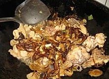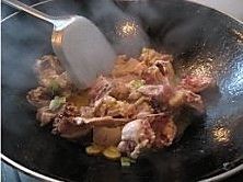 锅里加油烧热,下葱花和姜片,然后把鸡块倒进锅里,反复炒,炒到肉变颜色。