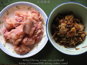 一个鸡骨架剁成小块,蘑菇泡好,洗干净。