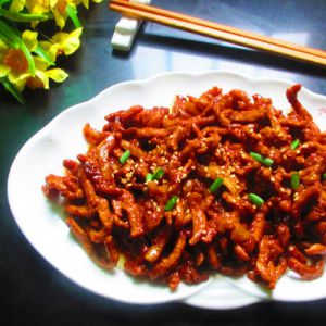 炒至甜面酱粘稠,使肉丝均匀挂上酱汁即可;盛出盘中