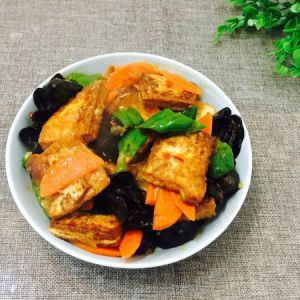下豆腐翻炒均匀后加入黑木耳翻炒,加入适量生抽