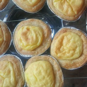 过滤后,每个蛋挞皮里倒入八分满的蛋挞液,(倒蛋挞液的时候,烤箱预热五分钟),上下火200度烤25分钟,表面上色即可。