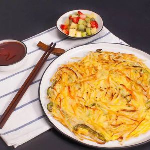 取锅,热油,倒入混合好的食材,小火慢煎。