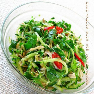 黄瓜先切片再切成丝,香菜切段,红辣椒切成圈;