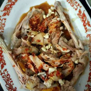 有花生的把花生炒好,家里没花生了,我就没放,把辣椒面,生抽,大蒜,倒入碗里,然后烧一点油,烧热后倒入碗里,和辣椒面一起搅拌。鸡腿泡的差不多的时候拿起来用刀切开,或者手撕开,我是用手撕的。味道很好吃。家人很快吃光了。