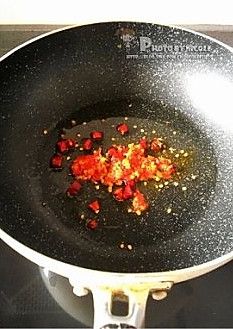 另起锅,加适量油,烧至九成热,关火,放入切碎的干辣椒和辣椒酱,榨出香味;