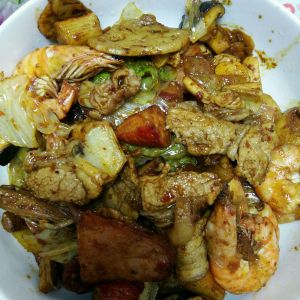 除了五花肉、生菜(比较好熟,所以最后下锅就行),所有肉菜过油炒8分熟,装盘待用。