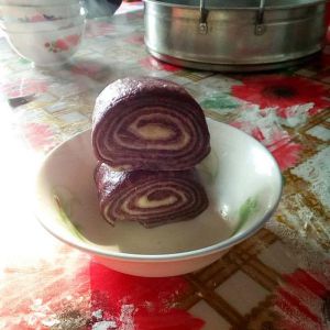 面团放在温暖的地方醒2两个小时后,把紫米和成的面团放在面板上,擀薄,另一块同样擀薄