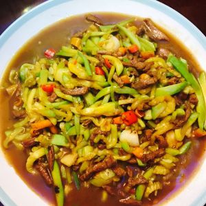 倒入爆炒过的牛肉丝一起混炒 加黑胡椒味精即可出锅.