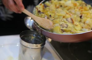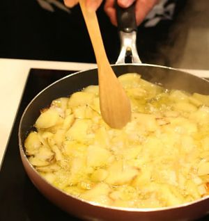 锅中加入大量橄榄油,加热。加入土豆和少许食盐,若加洋葱,则在加入土豆后放洋葱。使用中火
