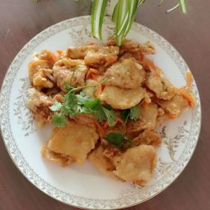 倒入拌好的芡汁,待沸腾时加入炸好的肉片翻炒几下出锅,淋上香菜。