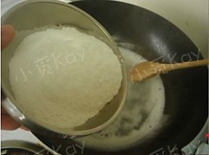 立刻倒入全部的糯米粉,快速搅匀,使糯米粉和水完全混合,成为粘稠的馅状。关火。