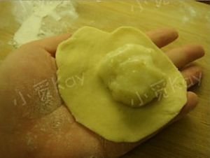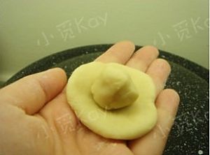 将一块糯米馅放在面团中央,包起来。
