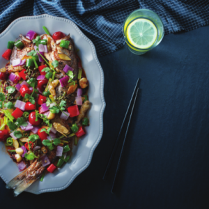将制作好的汤汁均匀地撒在海鲈鱼上,放入烤箱烤制即可。