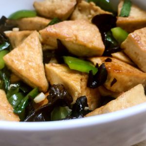 先把老豆腐切成三角形,彩椒切方块,木耳切小片,蒜瓣切成末,准备好油,盐,糖,生抽,蚝油