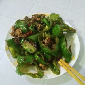 再倒入青椒,翻炒均匀。什么都不用加,豆瓣酱的味够了