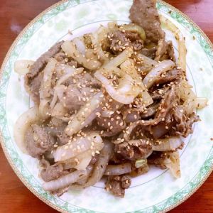 我买的孜然是颗粒比较大的那种,多放一点,小火煸香后,放入洋葱,而后加入羊肉,放入盐,适当调味。