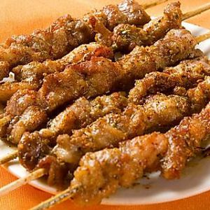 腌制好的肉丁,用竹签串成串。把剩余的5克料加入食用油和少许的水淀粉放入碗里调成料汁,也可以直接放干淀粉,再加入一点点的水。把调好的料汁刷在肉串表面。