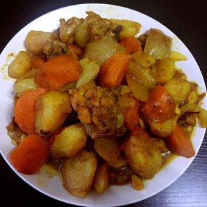 把土豆,胡萝卜,洋葱放进去,继续翻炒。倒入少量老抽
