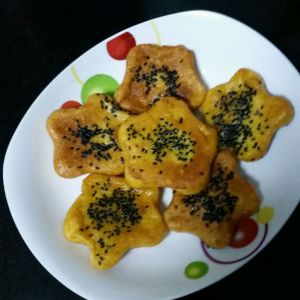 上锅前两面撒上芝麻,要压实。小火煎炸,两面金黄即熟