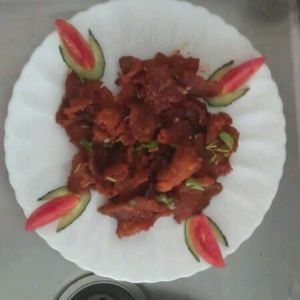 国内放少许油,锅热后放入番茄酱,勺子不停地搅动,然后放入糖,在加入醋,这时火不可过大,见糖化开成浅黄色时加入炸好的肉,翻炒喜欢吃软点的可以加点水,然后加入蒜片(之前的蒜切成片);出锅前加入香菜沫。