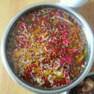 捞起煮熟的配菜,汤放一旁等会用。再热锅倒油炒香姜葱蒜及海椒花椒,炒香之后加豆瓣酱继续翻炒,炒至辣香味出倒如刚刚的汤,烧开